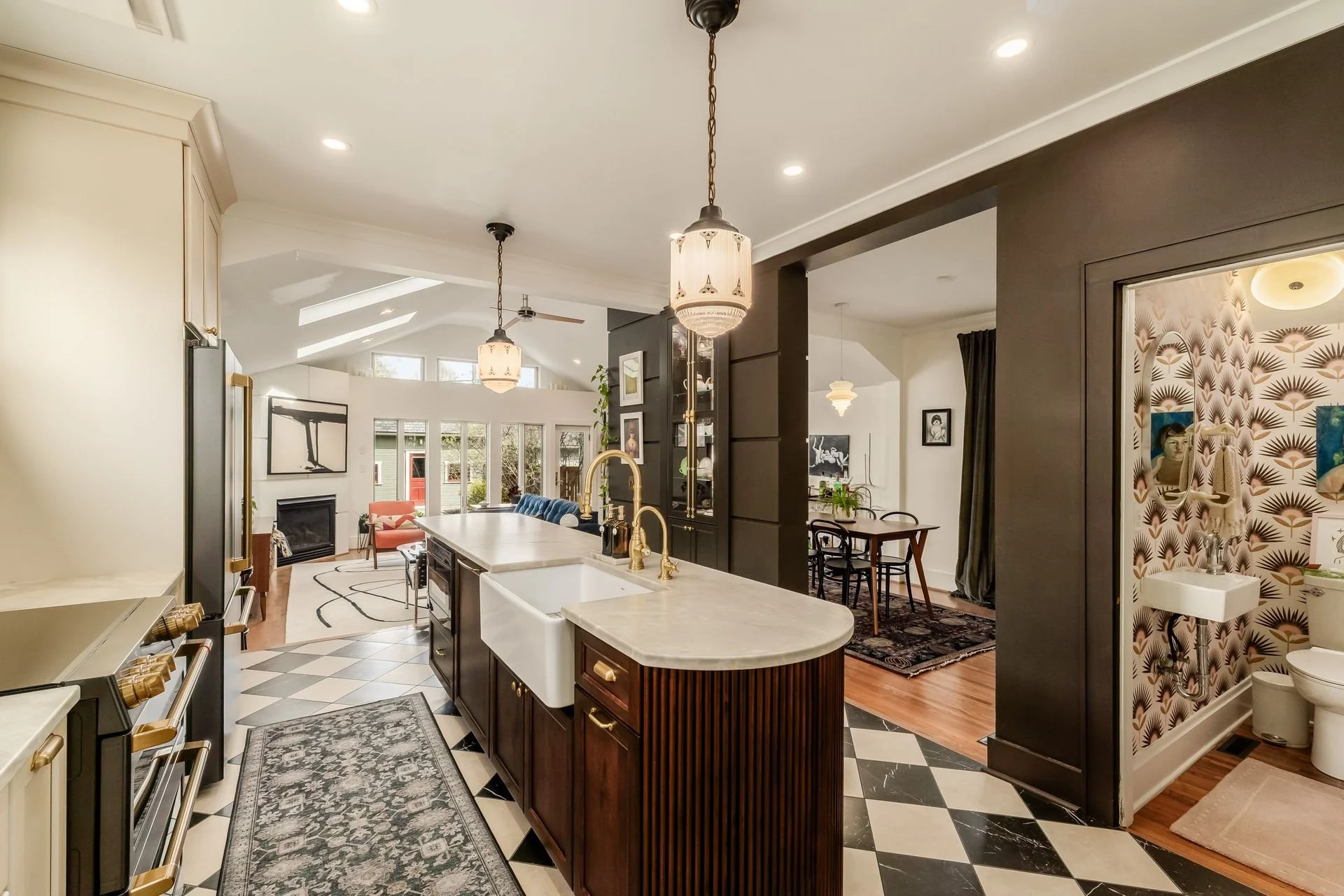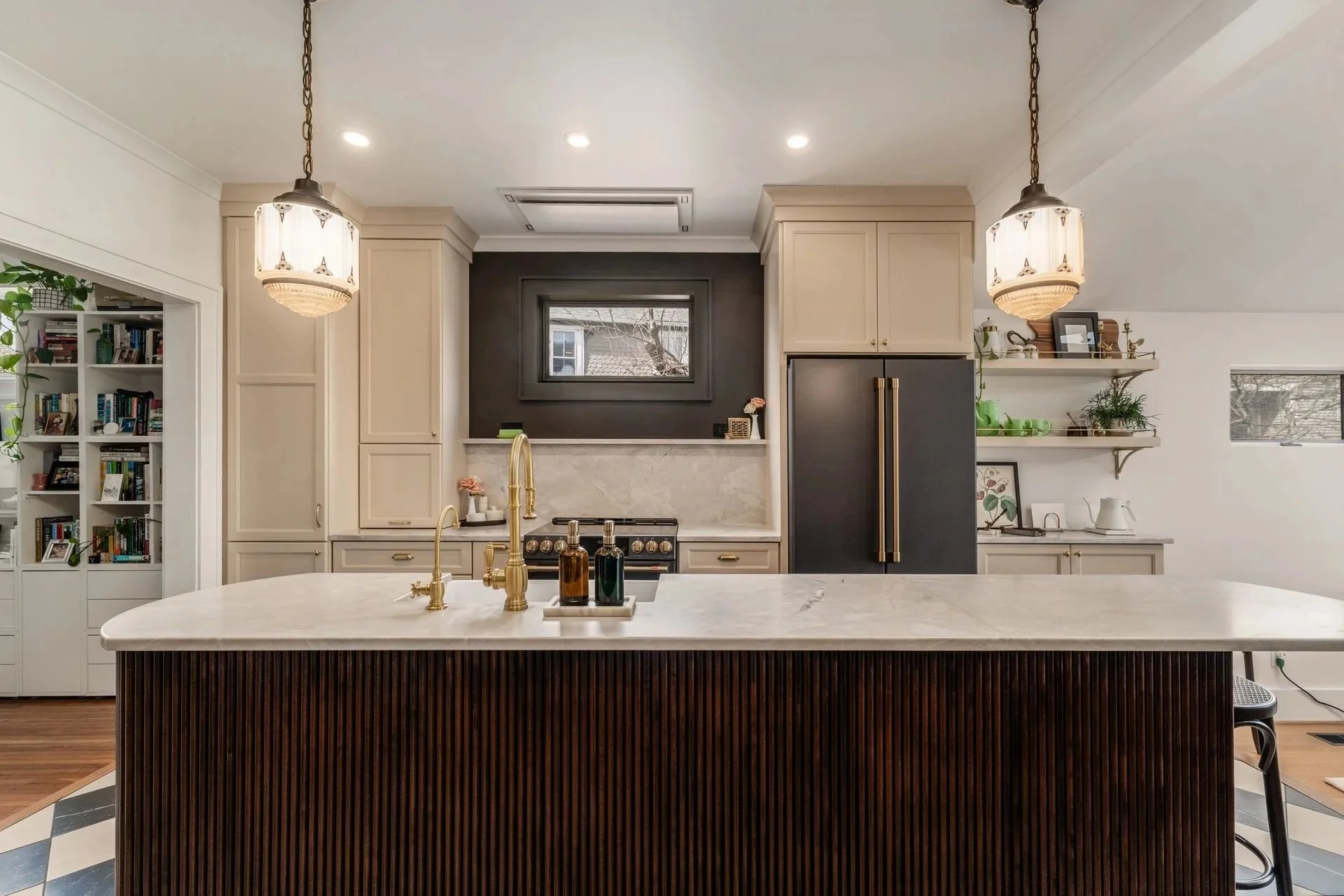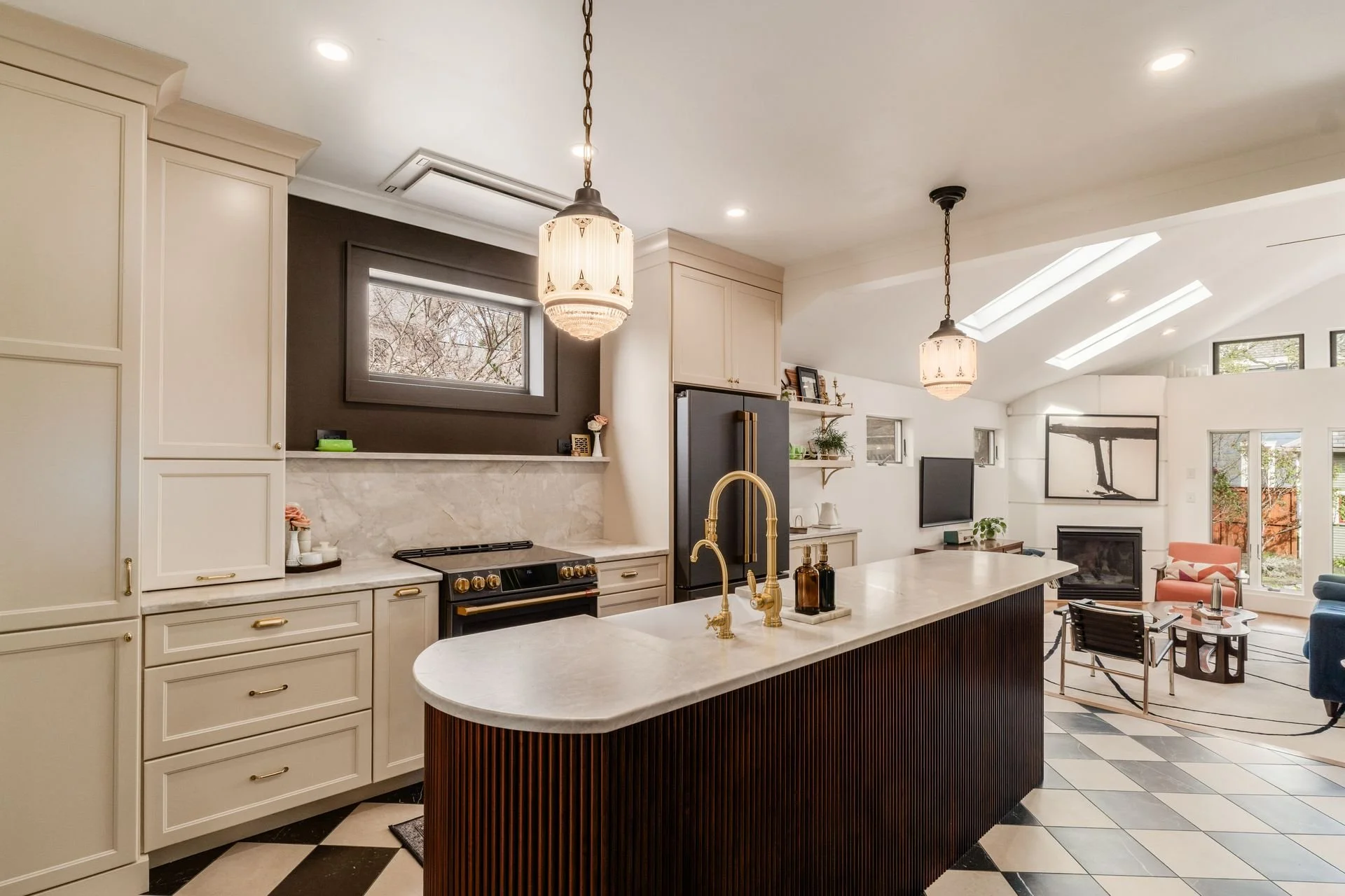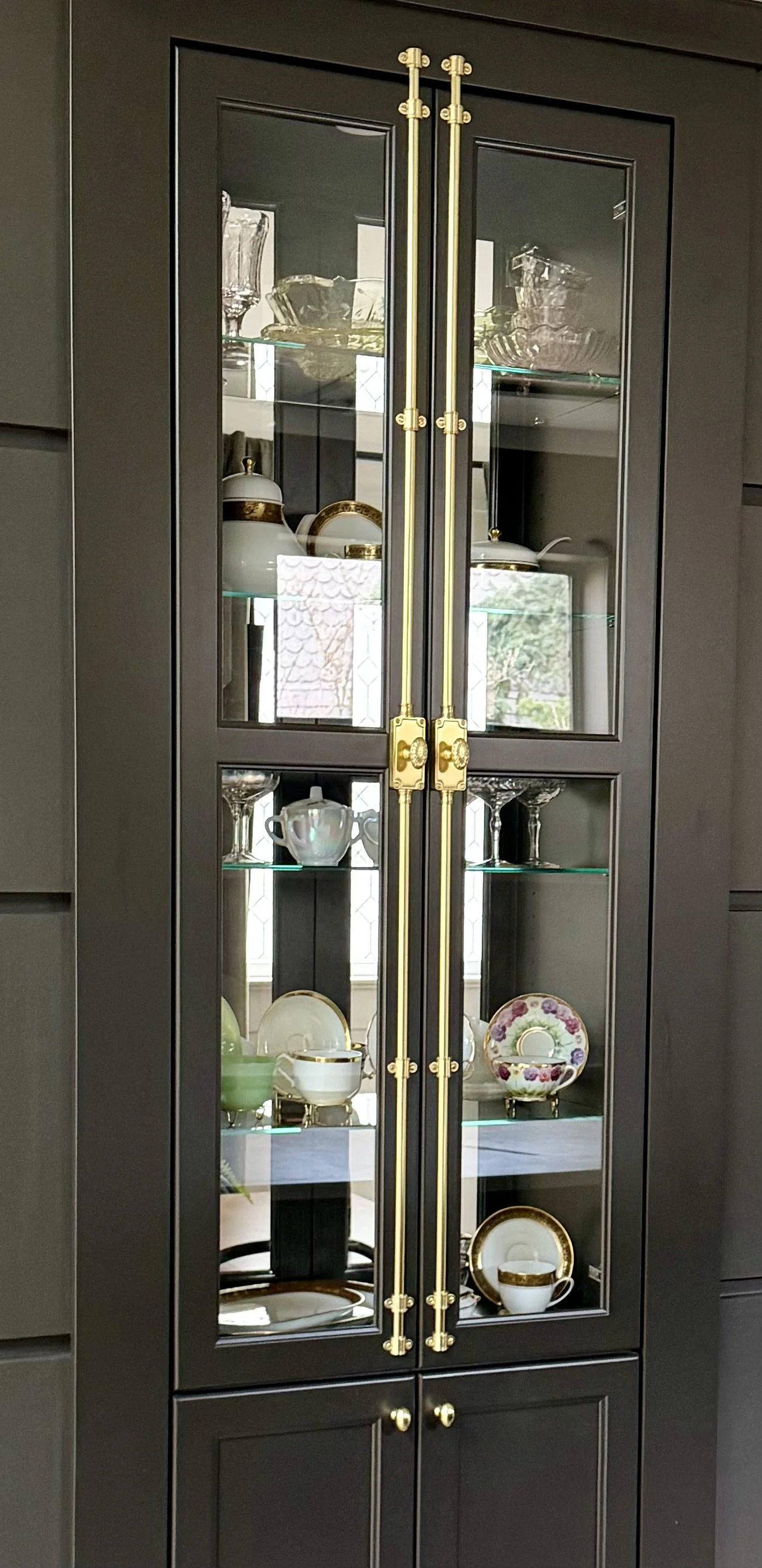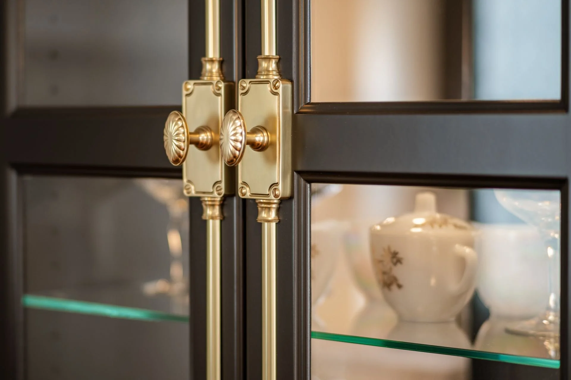 New life was restored into this kitchen with every elevated element. The fluting around the island adds tactile texture, while the rounded counter delivers a uniquely warm finish. To integrate the kitchen into the dining room, a dual-sided China cabinet with Cremone bolts was implemented. The RL family filled it with treasured tea sets that blended effortlessly in the cabinet.