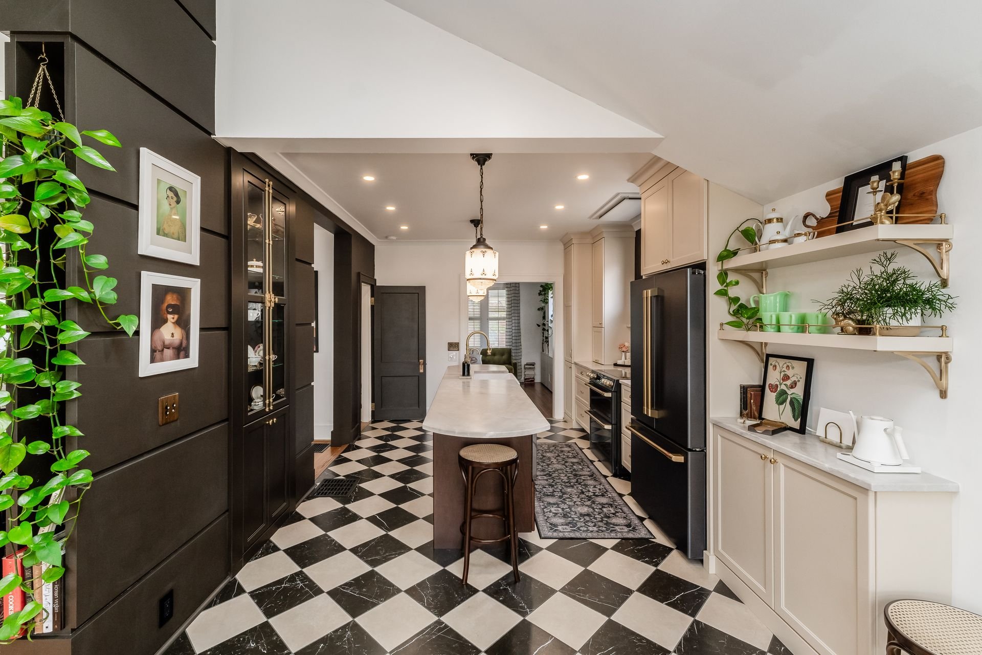 Once the new window was installed, we focused on elevated appliances, vintage inspired details and smooth surfaces. Keith used natural stone for the counter and flooring with a regal checkerboard pattern. Custom built cabinetry was installed for quality with every piece built for organization.