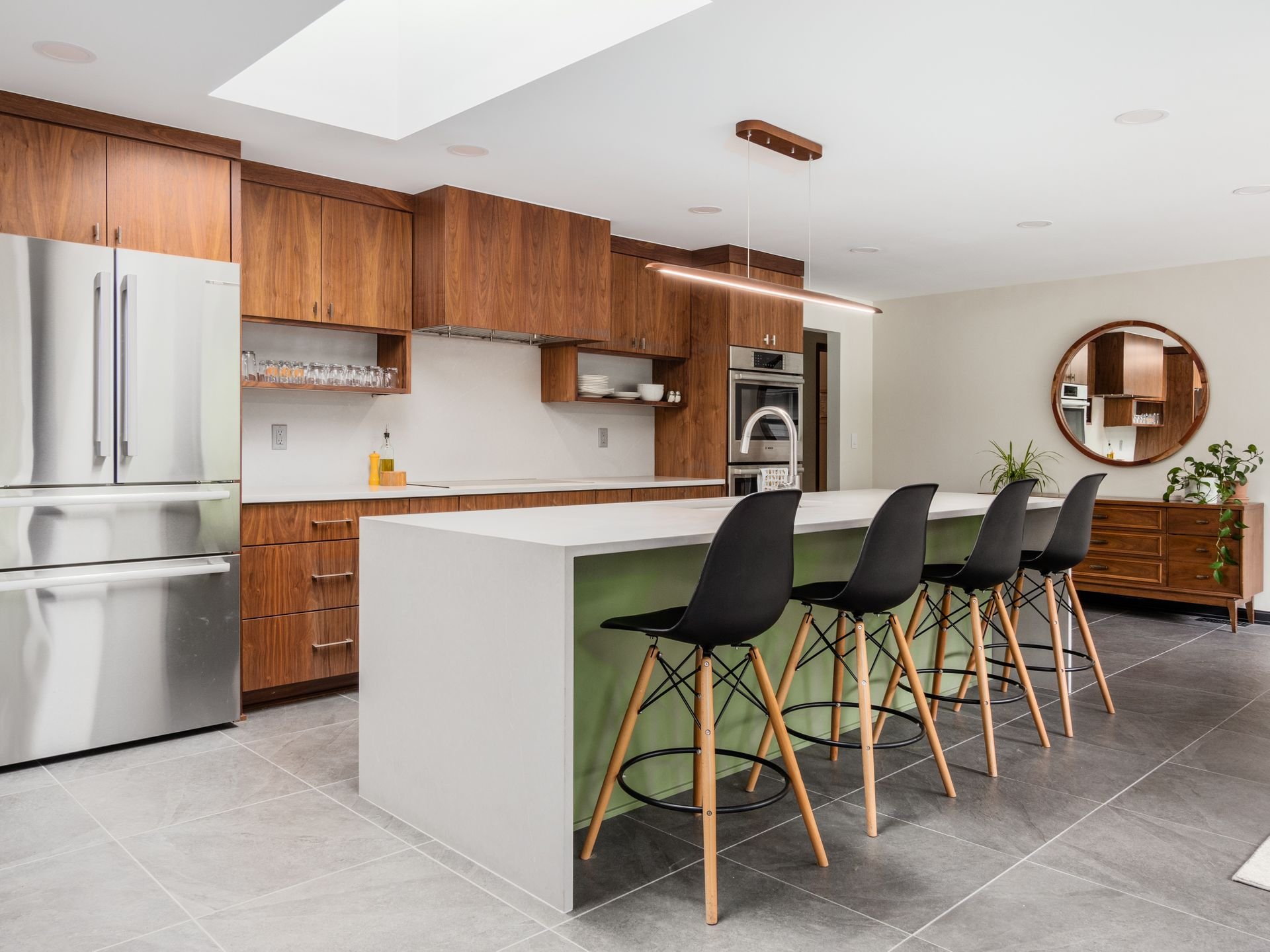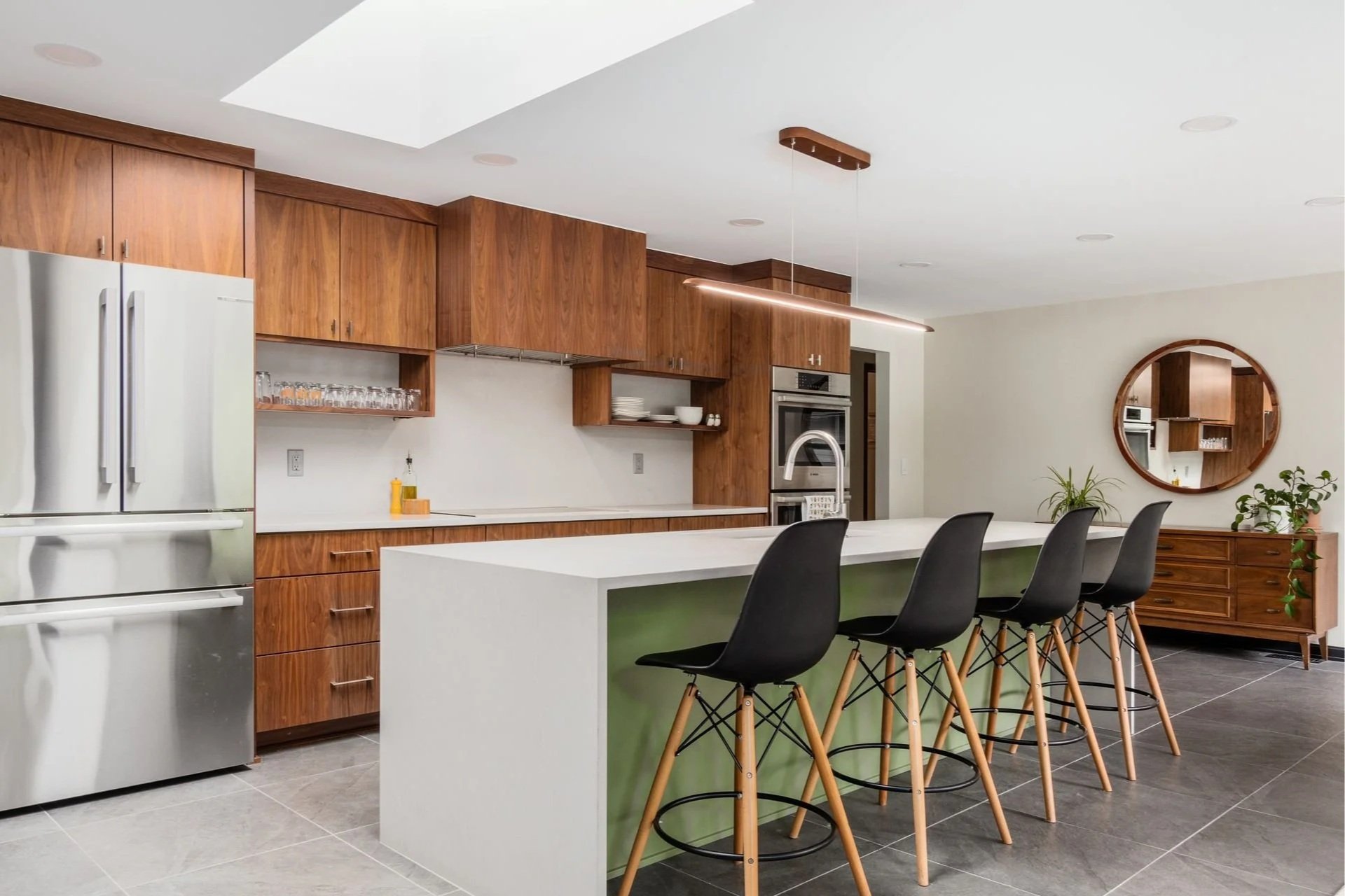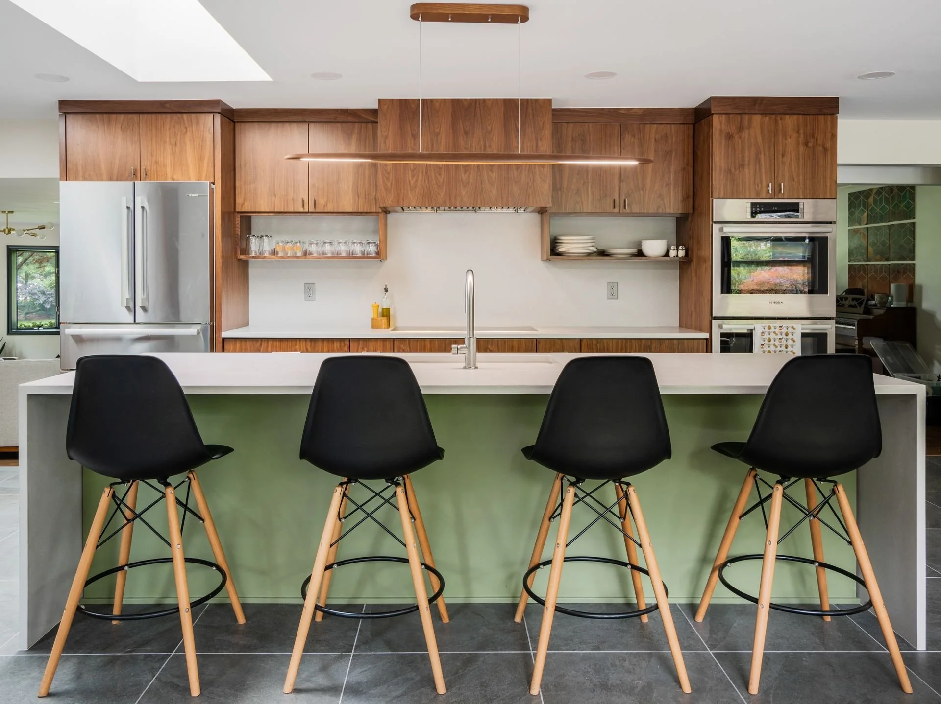 By removing the wall between the kitchen and back hall, along with the dividing peninsula, we opened the space to light and connection. An enlarged opening to the family room keeps everyone engaged. Custom slab walnut cabinetry anchors the design, paired with matte gray countertops and artichoke green accents.