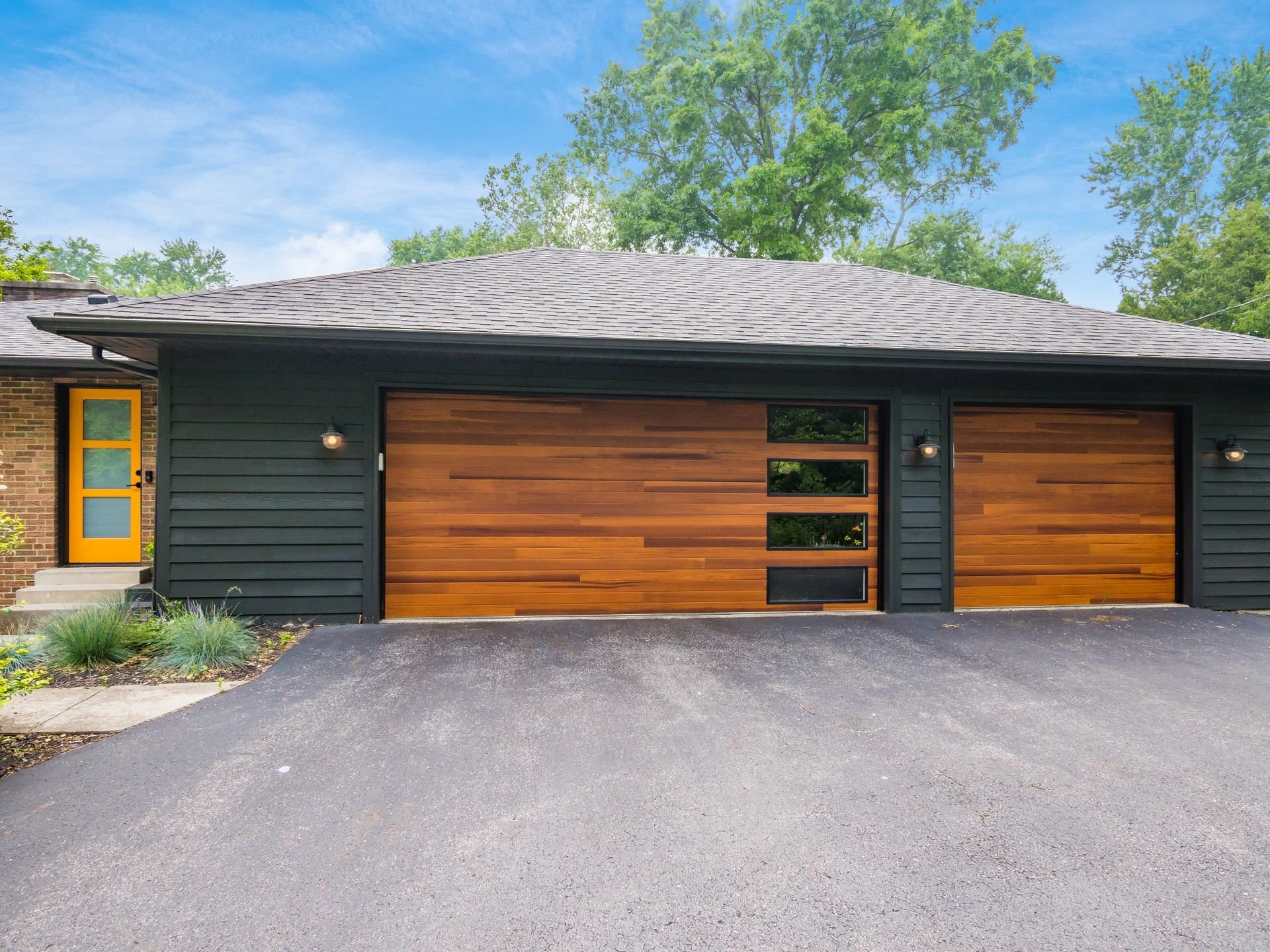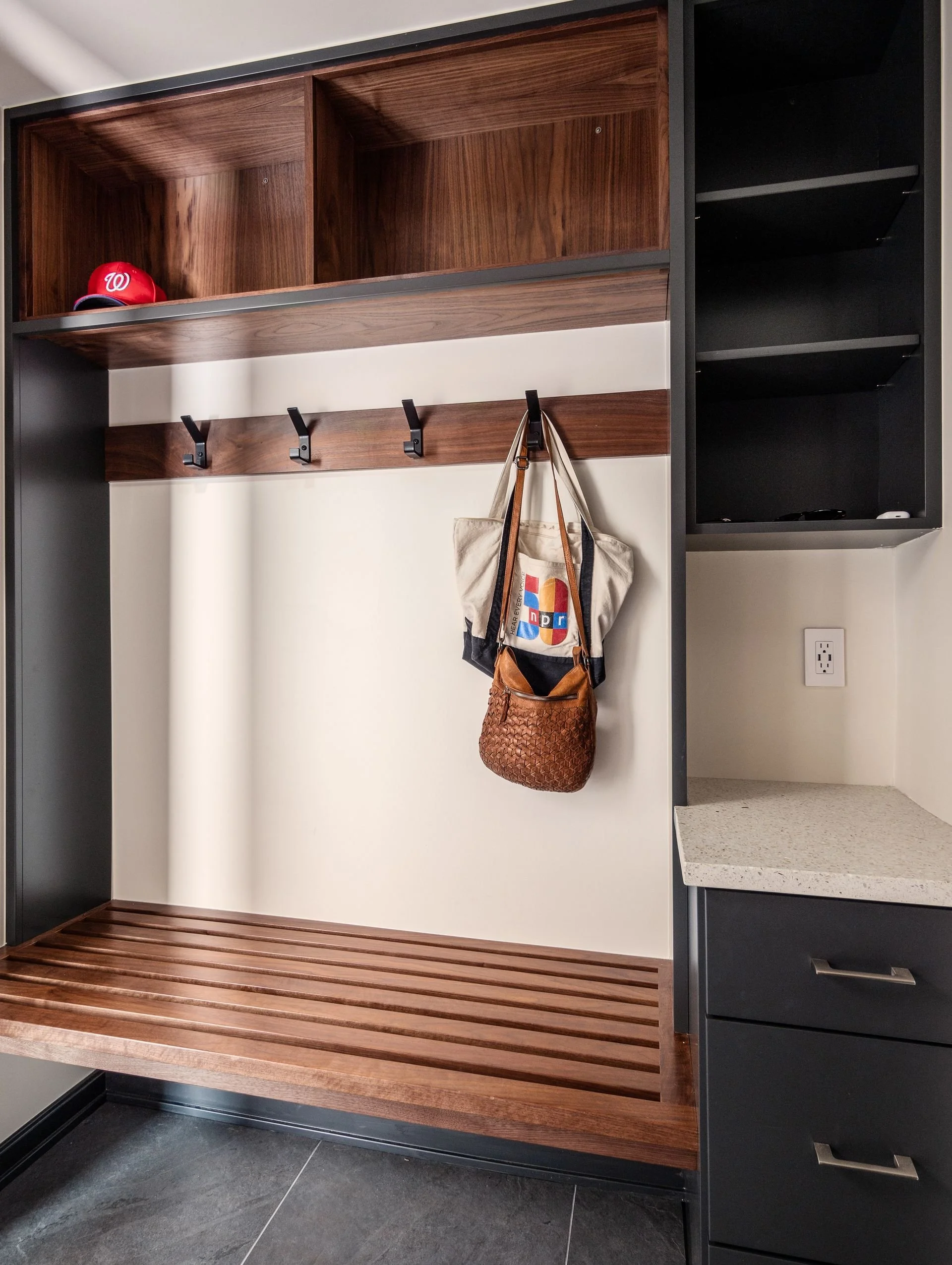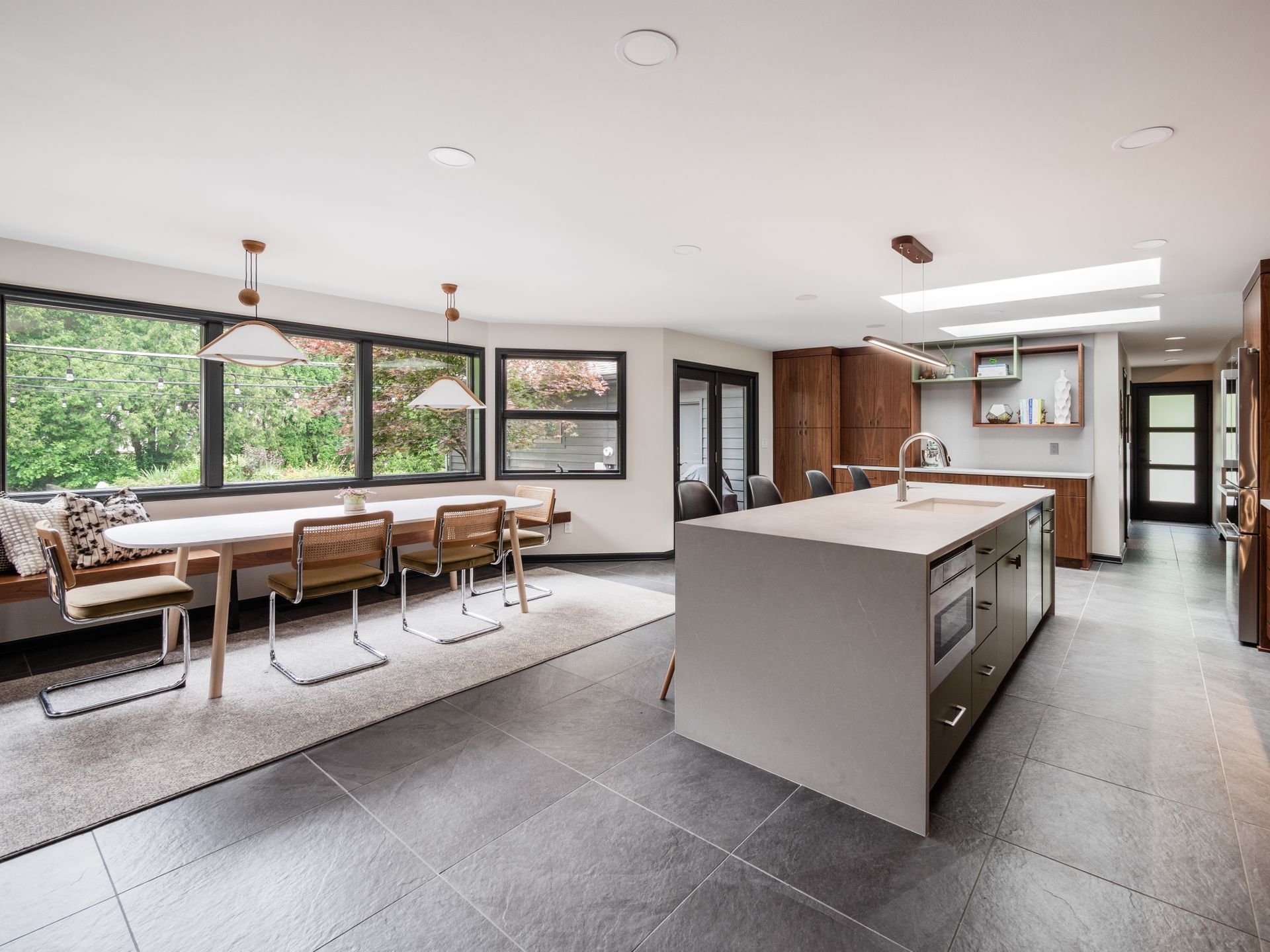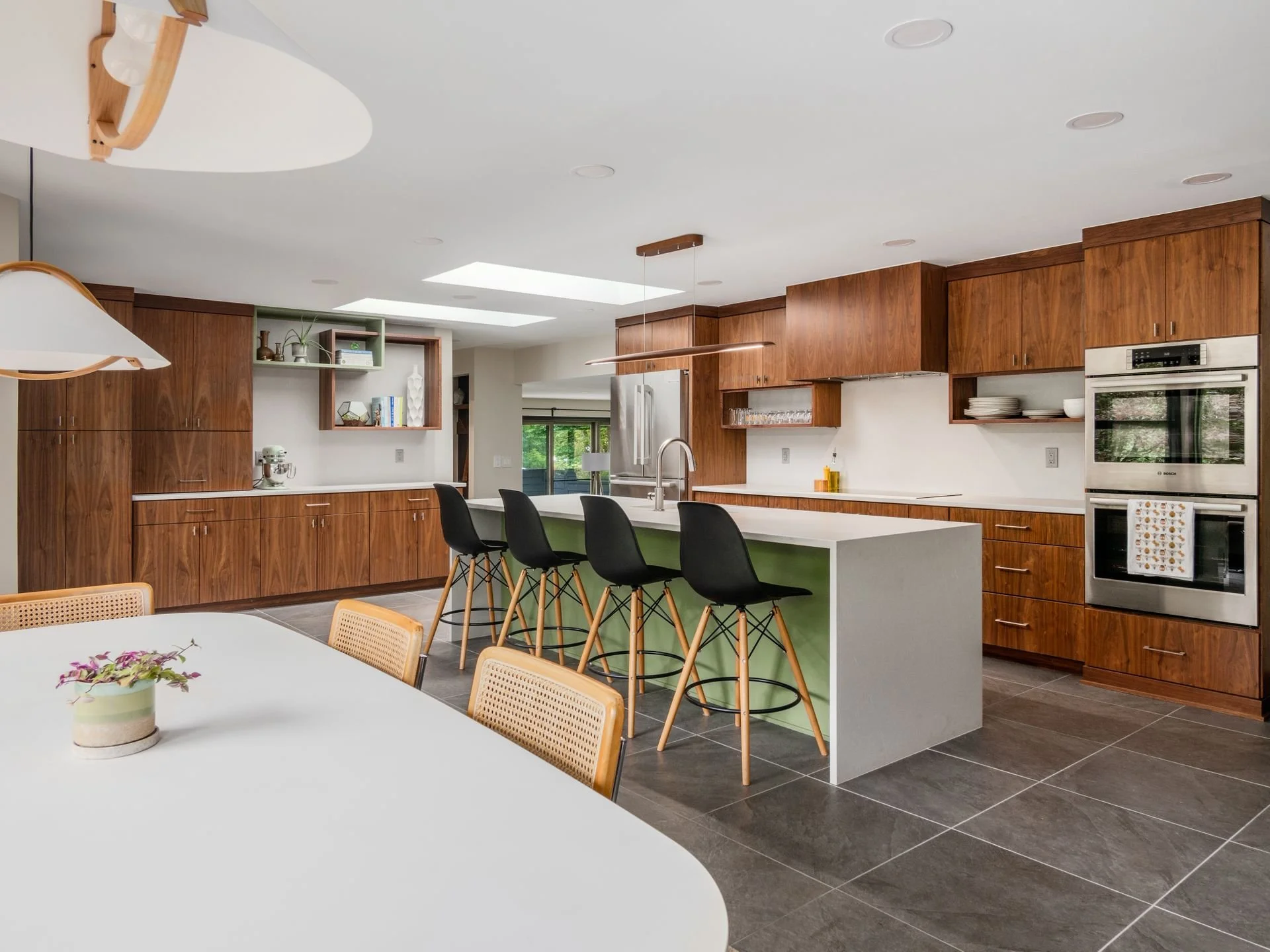 By removing the wall between the kitchen and back hall, along with the dividing peninsula, we opened the space to light and connection. An enlarged opening to the family room keeps everyone engaged. Custom slab walnut cabinetry anchors the design, paired with matte gray countertops and artichoke green accents.