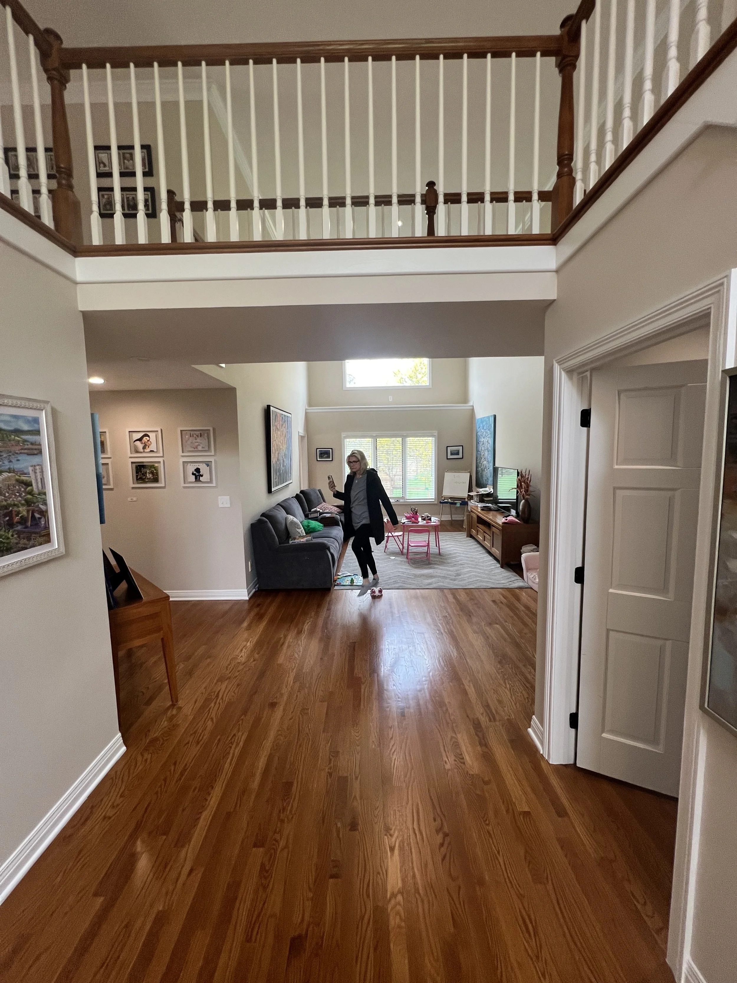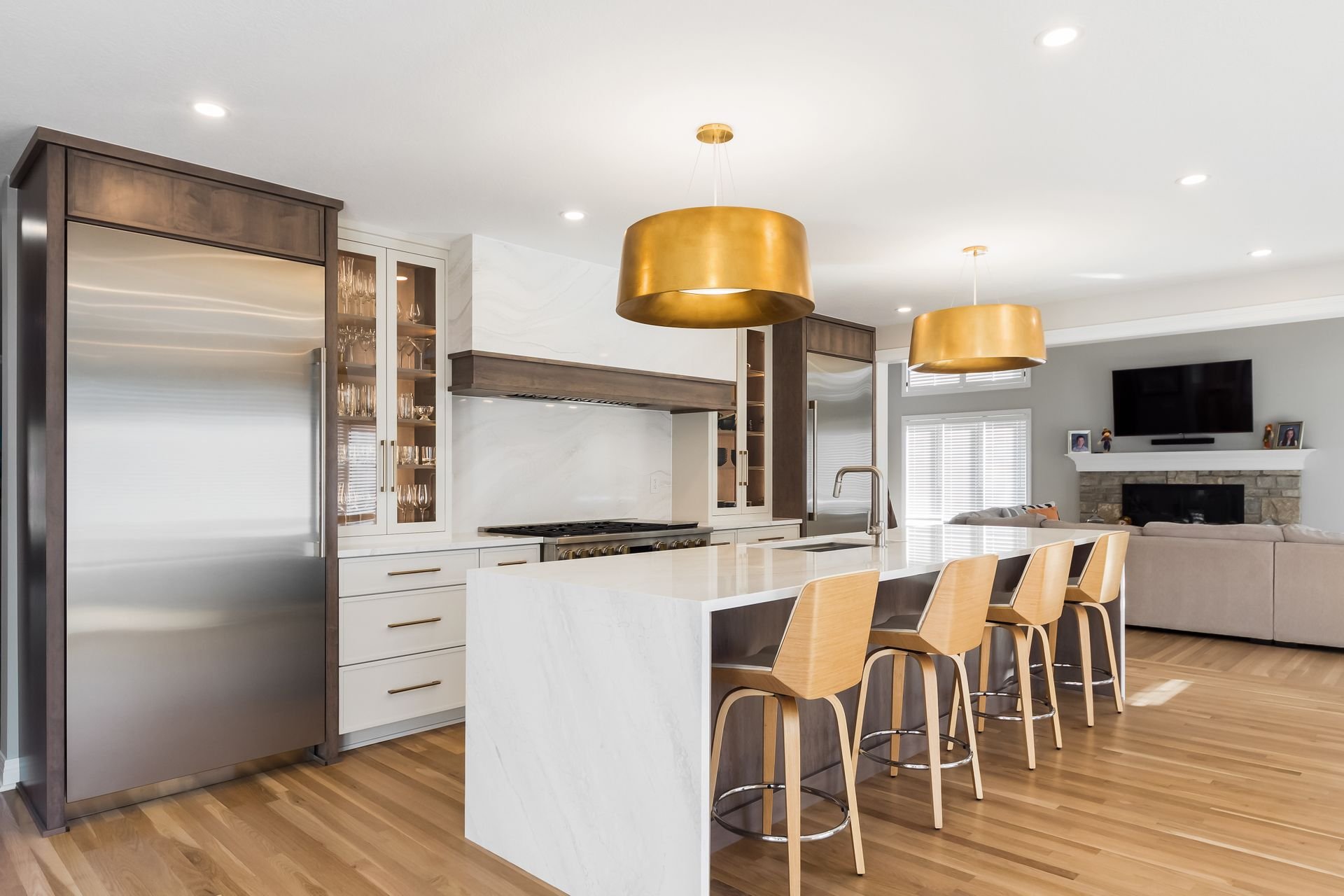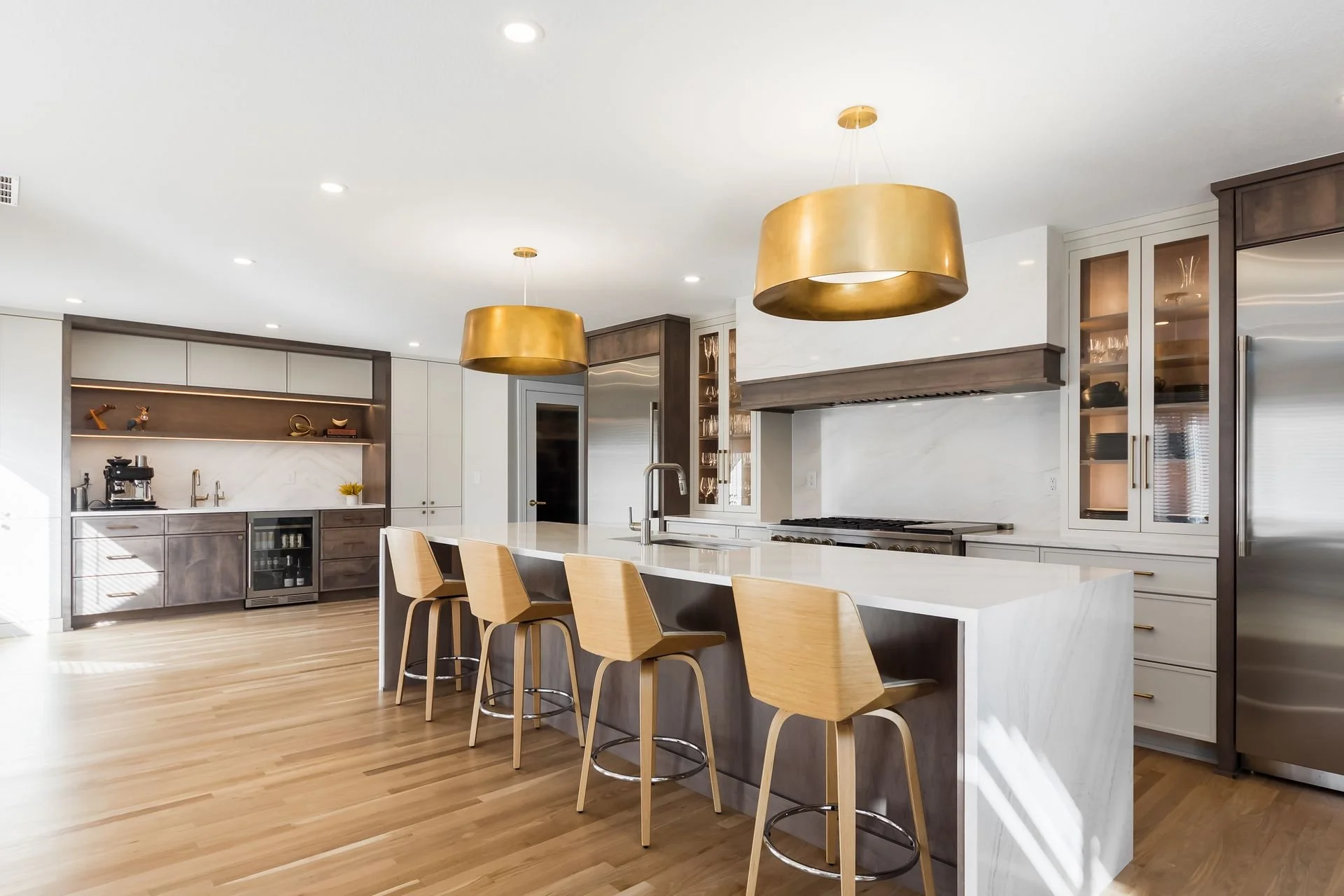 We reimagined the layout by absorbing the two-story dining room into the kitchen footprint, creating space for a larger kitchen, expansive island, walk-in pantry, and coffee bar, while adding a functional office above. A soft, neutral palette keeps the space open, light, and inviting.