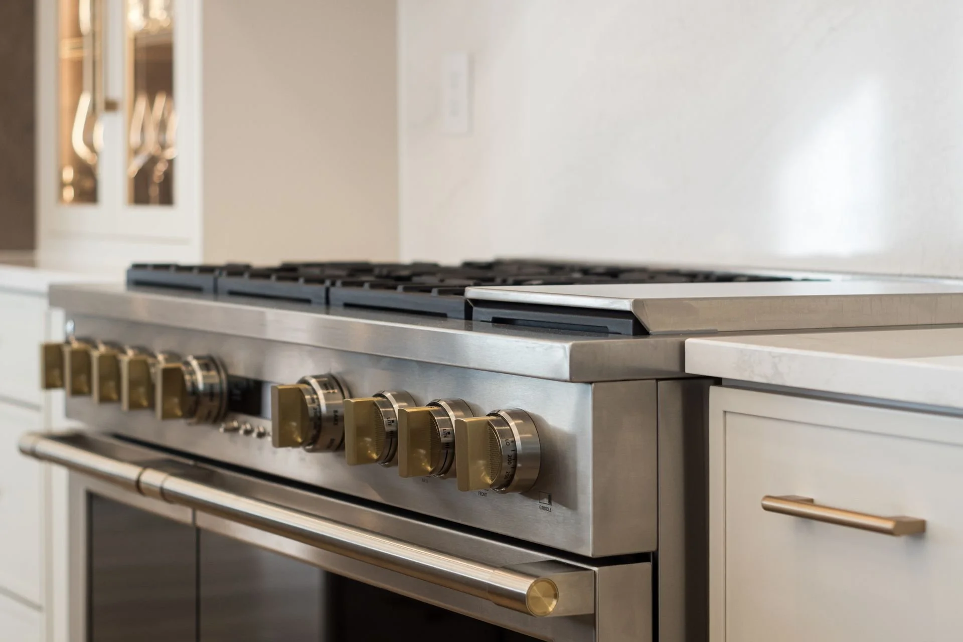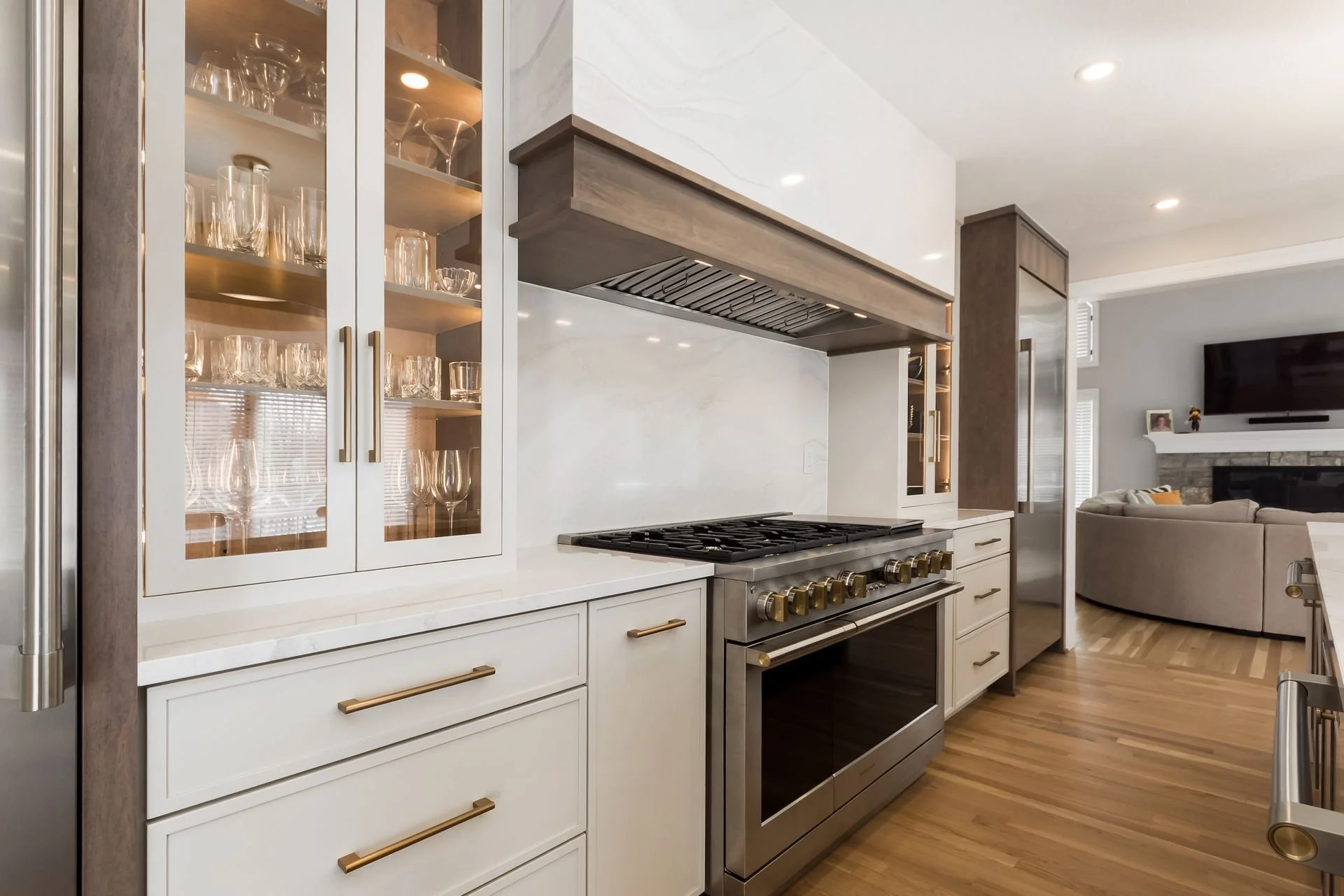 Intentional details elevate the finished space, from the Cambria quartz hood and full-height backsplash to the thoughtfully selected Visual Comfort lighting. Each element was chosen to feel refined yet approachable – quietly striking without overpowering the warmth of the home.